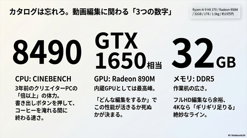 ここが一番大事なポイント。Radeon 890Mは内蔵GPUとしては最高クラスですが、あくまで「内蔵GPU」です。数年前のエントリーゲーミングPC向けGPU「GTX 1650」と同等レベルの描画力があると言われています。動画編集でGPUが効くのは、リアルタイムプレビュー・エフェクトの適用・書き出しの一部。つまり「どんな編集をするか」によって、この性能で足りるかどうかが変わるんです。