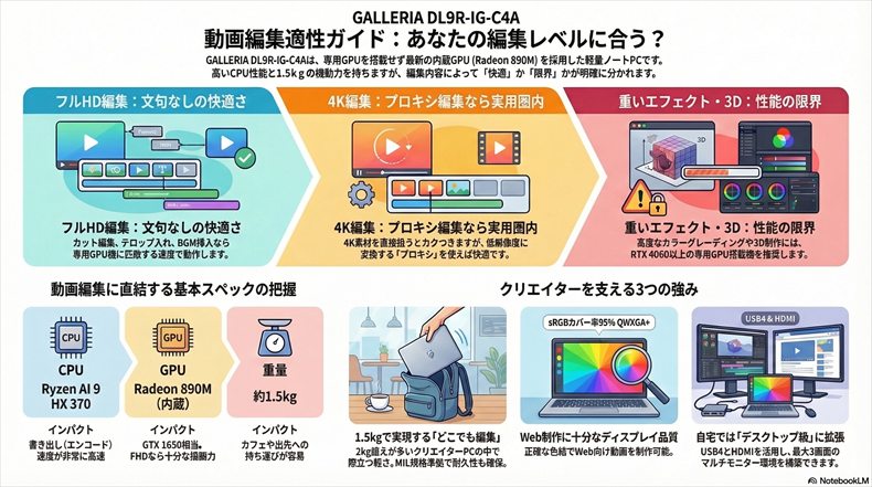 特に、フルHD動画編集がメインで持ち運びを重視する人。カフェやコワーキングスペースでも動画編集がしたい人。「最初の1台」として性能と価格と携帯性のバランスを求めている人。この条件に当てはまるなら、GALLERIA DL9R-IG-C4Aは間違いなく候補の筆頭に入るべきPCです。